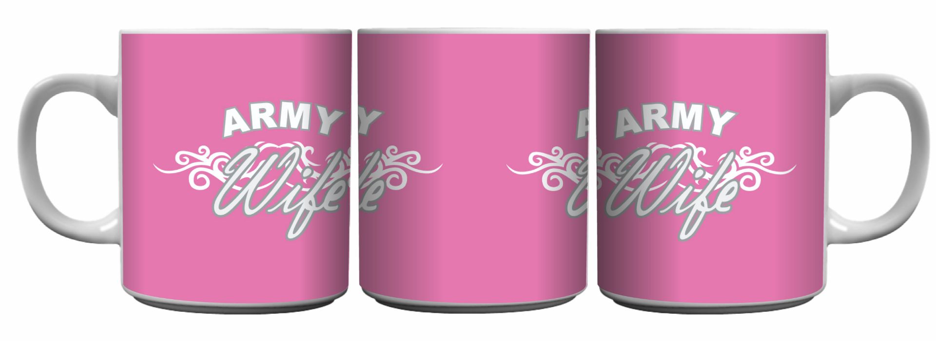 Army Wife with Scroll Design on Pink Background Sublimation 15 oz. Ceramic Mug